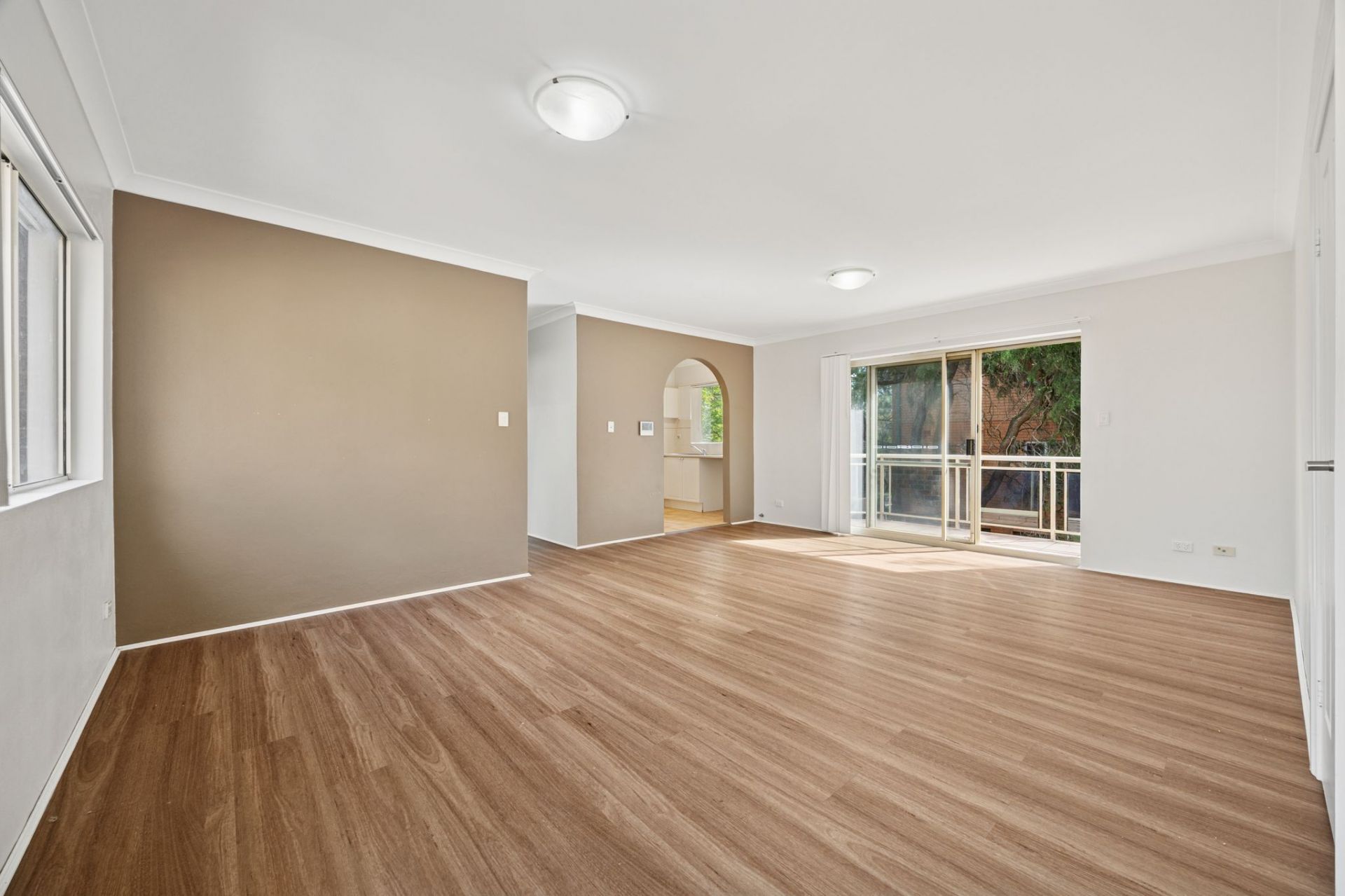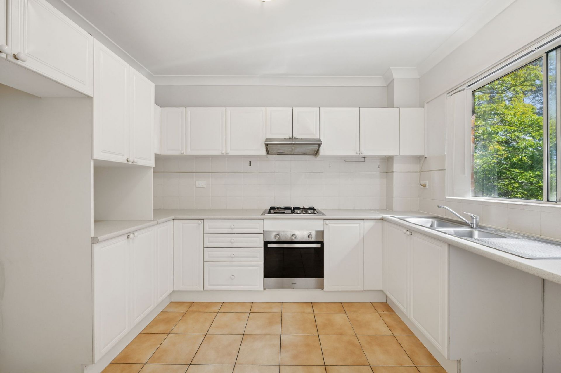 The expansive living and dining area is a standout, easily accommodating both lounge and dining settings while still feeling open and airy. Large glass doors extend the space to a private balcony with a leafy outlook. The generous kitchen is bright and functional with gas cooking and plenty of room to move.